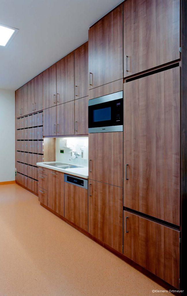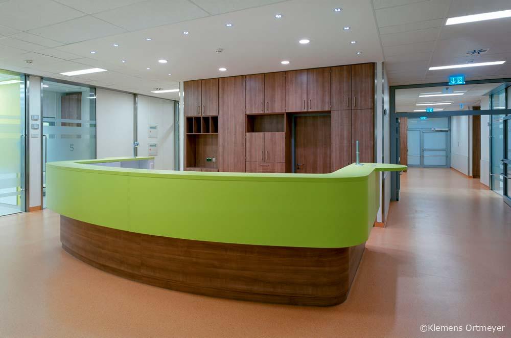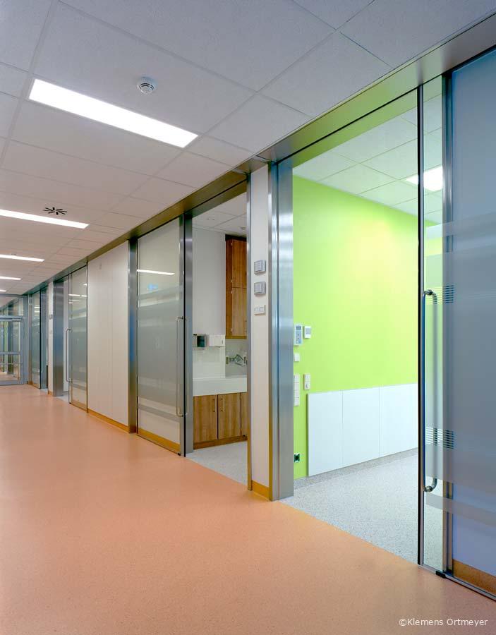 Bei Konzeption und architektonischer Gestaltung der neuen Intensivpflege wurden bewusst weiche Faktoren in den Mittelpunkt gestellt. Die großen Glasschiebetüren im Flur sorgen sowohl für die notwendigen Einblicke zur Patientenüberwachung als auch für eine abwechslungsreiche Belichtung der Flurzone. Der zentral angeordnete Dienstplatz mit dem multifunktionalen Überwachungstresen schafft durch seine offene Gestaltung optimale Arbeitsbedingungen und einen umfassenden Überblick.